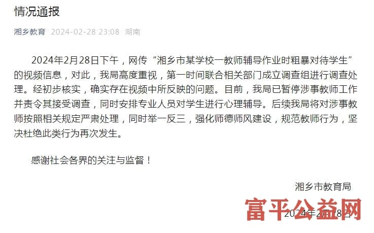 2月28日,一段“老师在办公室粗暴对待学生”的视频在网上流传,引发社会广泛关注。据视频显示,该教师在辅导学生作业时,对学生态度粗暴,大声呵斥,甚至动手推搡学生。