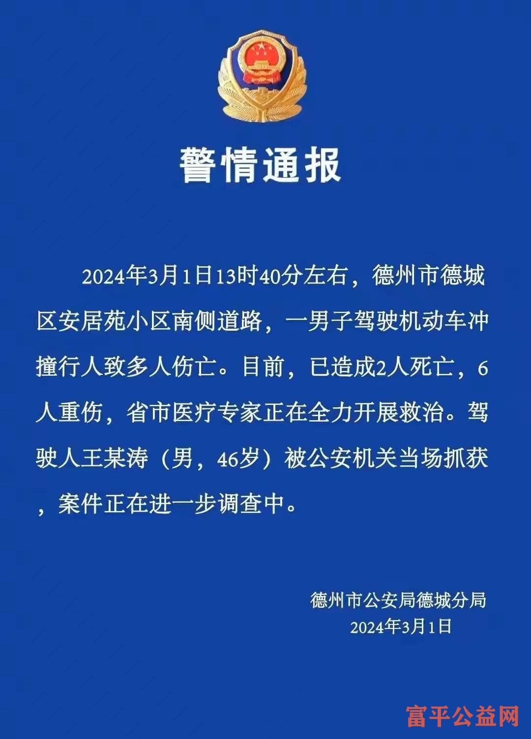 3月1日,山东德州发生一起严重交通事故,一名男子驾车撞人,造成2人死亡,6人重伤。德州市公安局德城分局迅速行动,当场抓获肇事驾驶人王某涛。目前,案件正在进一步调查中。
