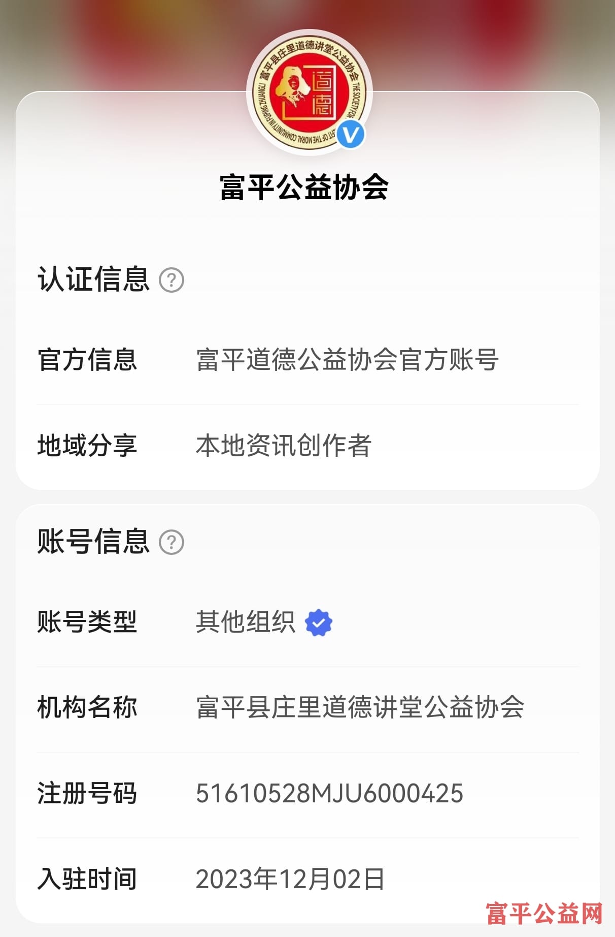 富平县庄里道德讲堂公益协会(简称:富平道德公益协会)于2023年12月2日正式开通百度百家官方账号。此账号为协会唯一官方百度账号,如有发现冒充行为,将移交司法机关处理。