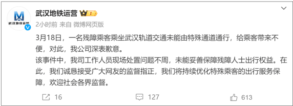 武汉地铁在回应中表示,他们在处理此事时未能妥善保障残障人士的出行权益,对此深感抱歉,并愿意接受社会各界的监督与指正。