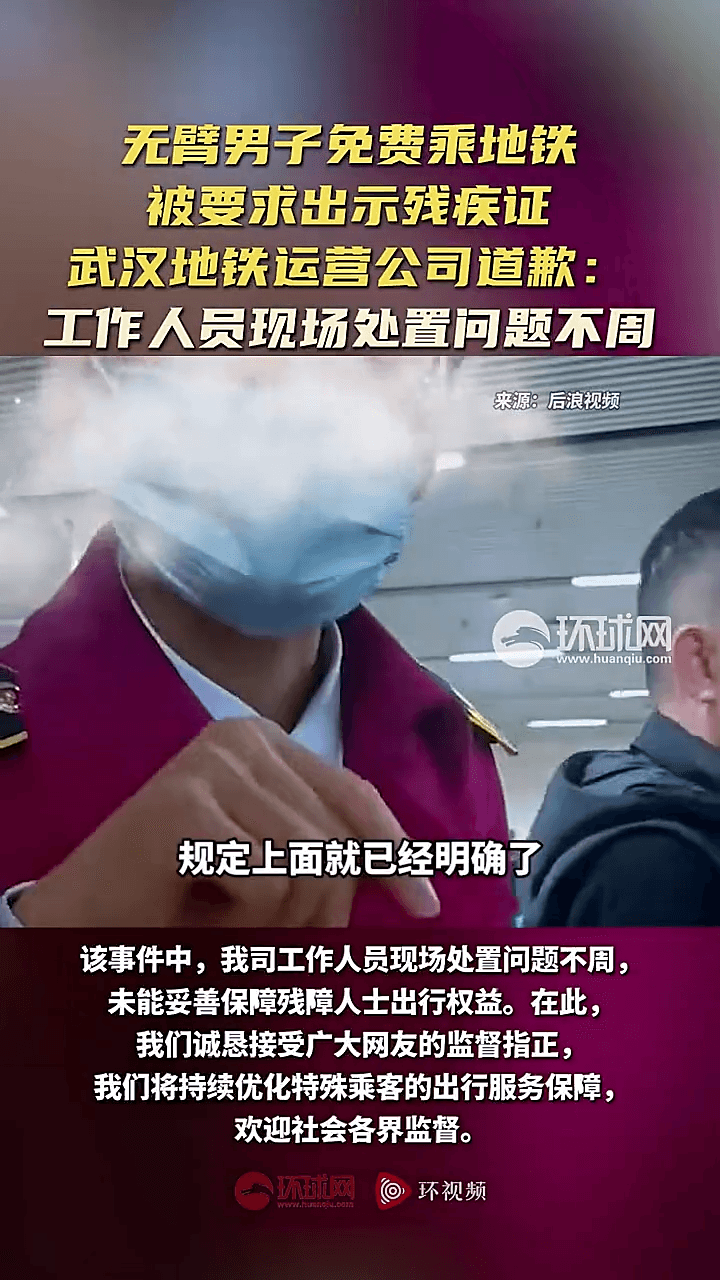 22日,武汉地铁就一起涉及无臂男子的争议事件公开致歉。