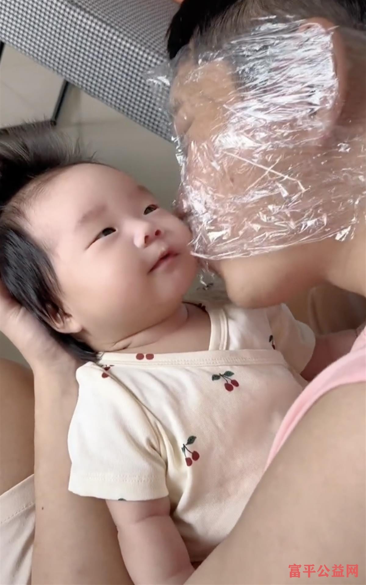 为了避免直接接触带来的细菌问题,这位爸爸巧妙地使用保鲜膜包裹自己的头部,以此实现与宝宝的亲密接触。