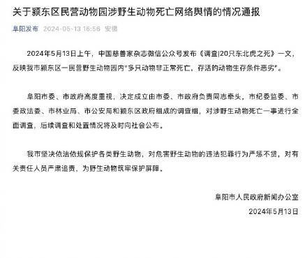 据阜阳发布通报:5月13日上午,中国慈善家杂志微信公众号发布《调查|20只东北虎之死》一文,反映安徽省阜阳市颍东区一民营野生动物园内“多只动物非正常死亡,存活的动物生存条件恶劣”。