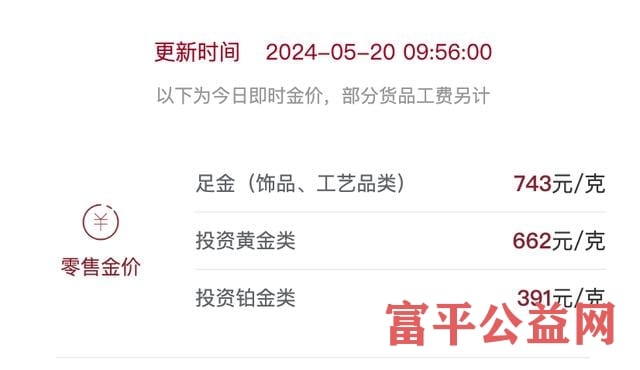 富平公益网讯 5月20日,国内黄金珠宝市场迎来历史性时刻。周大福、六福珠宝、潮宏基、周生生、老庙黄金等知名黄金珠宝品牌纷纷宣布,其国内足金首饰金价突破742元/克,创下近年来新高。