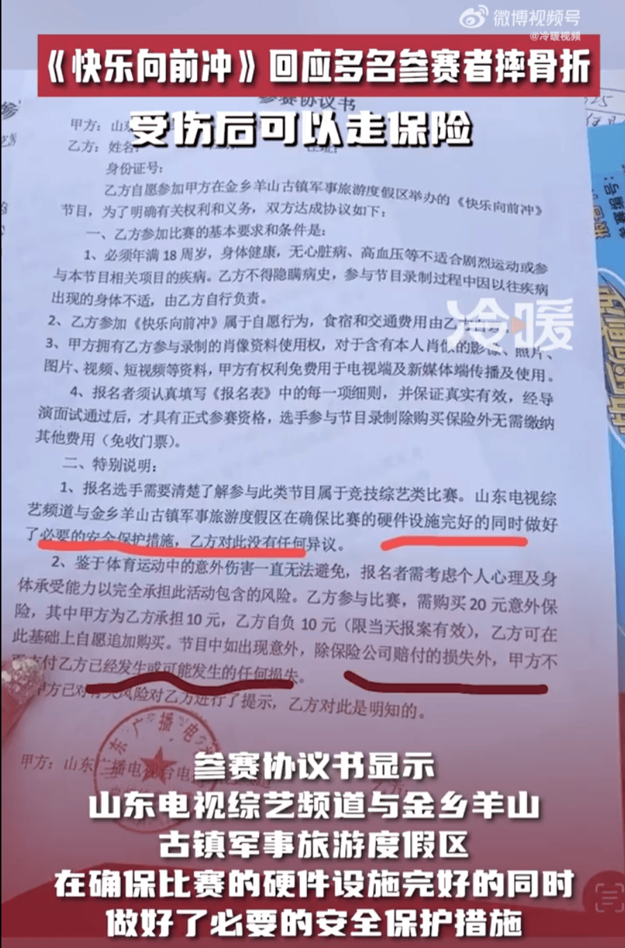 《快乐向前冲》节目组一名工作人员回应,会将问题和相关负责部门反馈,参赛者受伤后可以走保险。