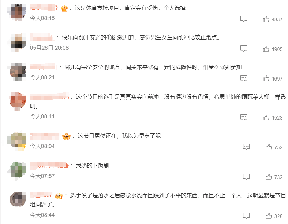 对此,有网友表示“体育竞技项目,肯定会受伤,个人选择”“闯关本来就有危险性,怕受伤就别参加”,也有网友表示“水浅且水底不平,是节目组的问题”。