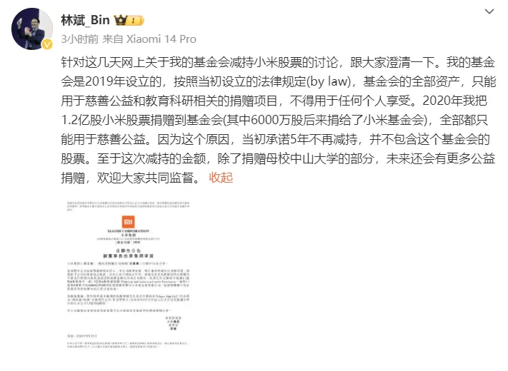 6月22日,小米公司副董事长林斌发微博回应了近期关于他的基金会减持小米股票套现的传闻。他表示:基金会的全部资产,只能用于慈善公益和教育科研相关的捐赠项目,不得用于任何个人享受。同时他还透露未来还会有更多公益捐赠。