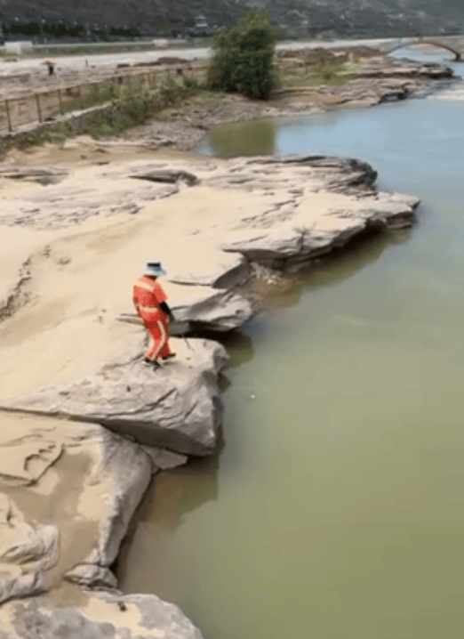 该网友的定位显示为山西临汾市的黄河壶口瀑布风景名胜区。视频里,一名身穿橙色衣服的工作人员正拿着钳子捡拾垃圾,将岸边的纸巾等垃圾直接扔进了河道里。