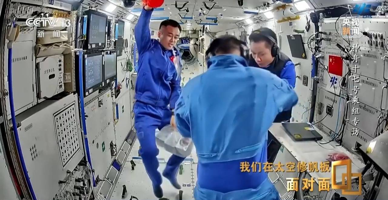 19时34分,神舟十六号航天员乘组顺利打开“家门”,欢迎远道而来的神舟十七号航天员乘组入驻“天宫”。
