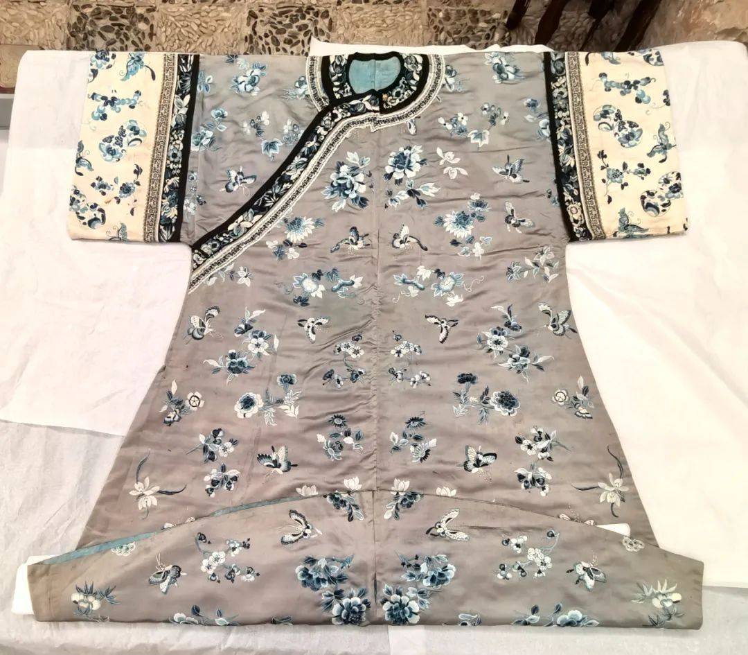 其中有3件旗袍为当时知名品牌作品,如“先施”“新新” “金刚”等。清代衬衣以江南苏绣的三蓝绣法装饰出清新秀丽的艺术风格,而对襟女褂则是精工细作,刺绣纹样和技法可以看到苏绣特有精细雅洁的地方韵味。上博方面认为,该批服装保存状况良好,能够补充馆藏江南主题和海派服饰系列的品类缺项,完善藏品体系,为后续展览和研究工作提供了重要的资源。