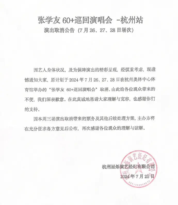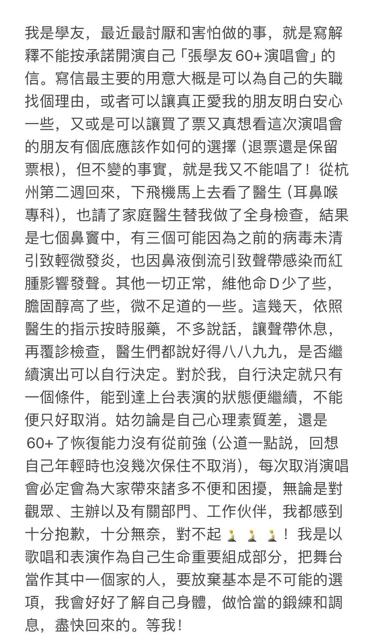 63岁张学友因病取消杭州演唱会!发长文道歉:对不起,我又不能唱了 来源: 搜狐娱乐 发布: 2024年7月26日 13:05 25日,张学友杭州站3场演唱会取消,他发长文道歉,透露之前的病情导致发炎,声带红肿影响发声:“我又不能唱了”,但他表示只要能达到上台表演的状态,就一定会上台:“我是以歌唱和表演作为自己生命重要组成部分,把舞台当做其中一个家的人。” 内容举报 免责声明:本文转自官方媒体或协会发布(除网友投稿)。This article is sourced from official media or association releases (excluding submissions from netizens).本文链接:https://www.fpgynews.com/16909.html 责任编辑: 张军良GY_01