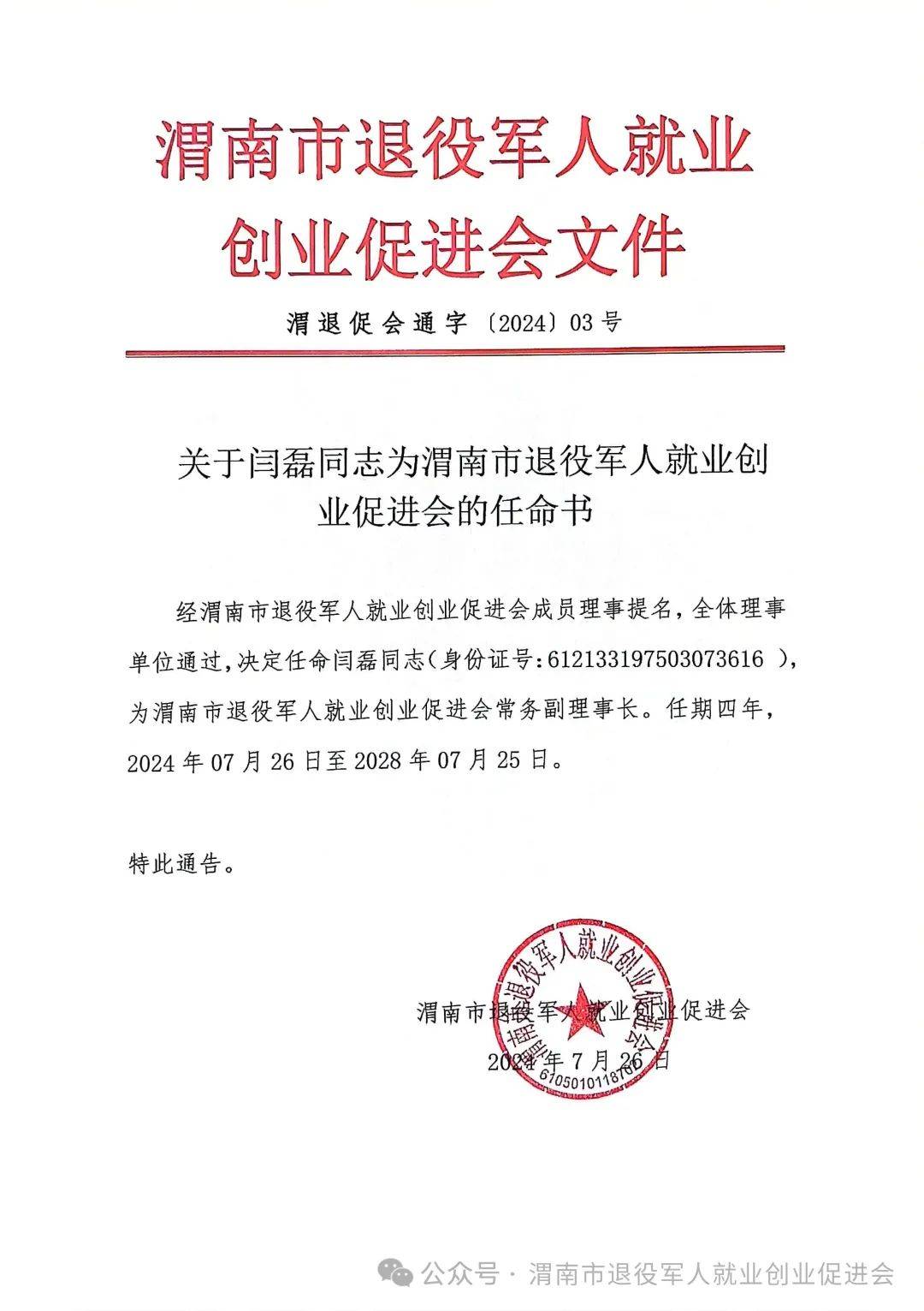 2024 年 7 月 27 日,渭南市退役军人就业创业促进会发布一项任命决定。经促进会成员理事提名以及全体理事单位的一致通过,闫磊同志被赋予重任,担任渭南市退役军人就业创业促进会常务副理事长一职。