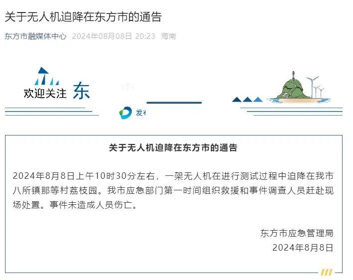 2024年8月8日上午10时30分左右,一架无人机在进行测试过程中迫降在东方市八所镇那等村荔枝园。该市应急部门第一时间组织救援和事件调查人员赶赴现场处置。事件未造成人员伤亡。