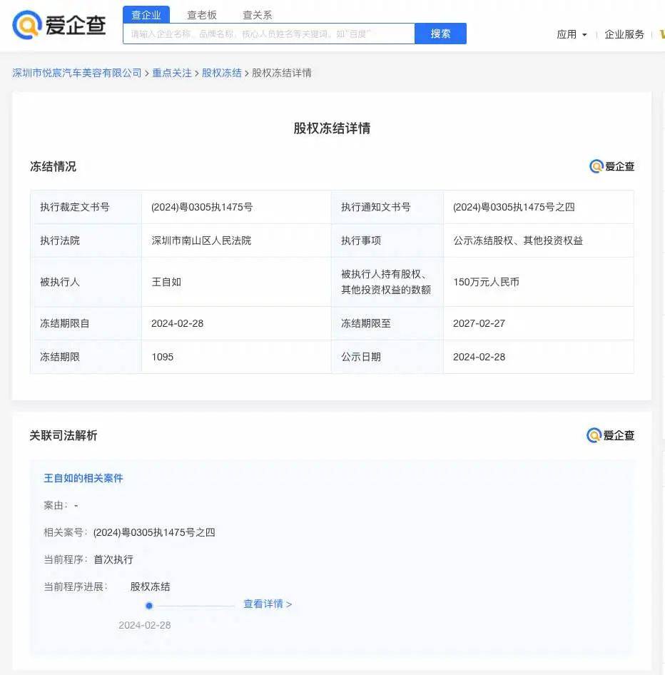 此前,王自如已因此案被强制执行3383.78万元,被冻结所持有的深圳市悦宸汽车美容有限公司150万股权。