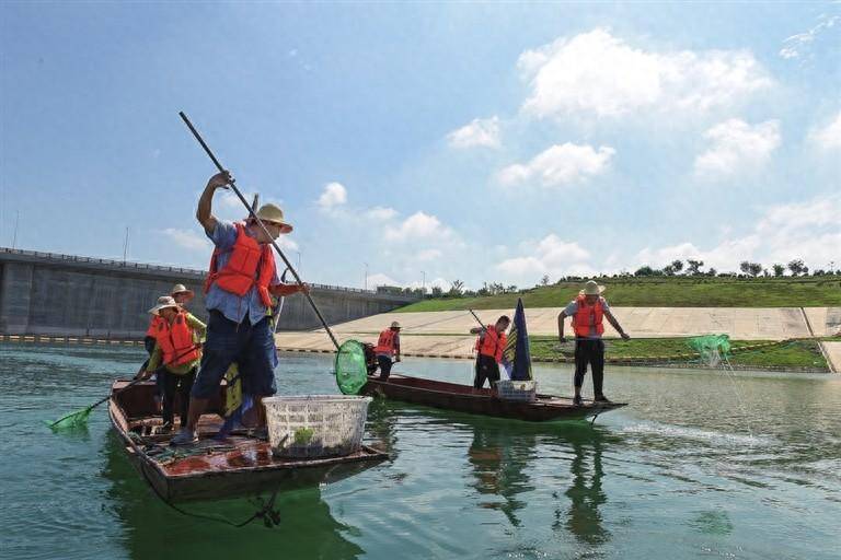 伸出网兜,顺势捞起水上漂浮物,装入储物筐中……8月14日一早,在淅川县汇入丹江口水库的上游水流灌河水面上,一艘带着“航运清漂”字眼的小船显得格外醒目,清漂员赵建峰身着安全服,头戴工作帽,手持大抄网,立在船头,开始了一天水上的清漂工作。