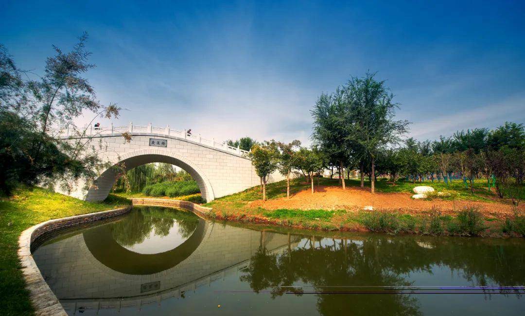 温泉河水流潺,芳草如茵,万木竞翠,廊桥曲回,假山亭台,霓彩如虹,如一条美丽的玉带静静地环绕在富平县城北部,诉说着沧海桑田的厚重历史,见证着今日富平的华丽嬗变。
