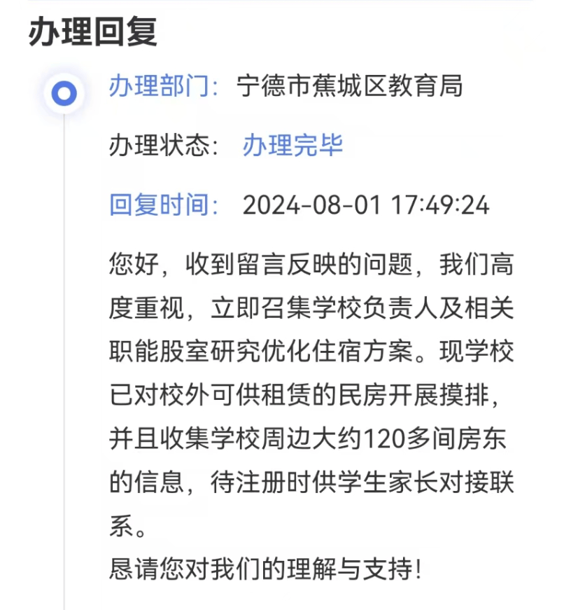8月14日,林先生的反馈得到了宁德市蕉城区教育局的回复。在回复中,宁德市蕉城区教育局答复称,九中(宁德市第九中学)是半寄宿制学校,现有学生1000人。校内可供寄宿生住宿的铺位,男生为180个,女生为230个。因2024届寄宿的高三学生毕业后腾出部分铺位,目前男女生舍铺位合计仅余140多个。而今年高一新生有312人,目前所余宿舍铺位远远无法满足高一每一个学生住宿的需求。