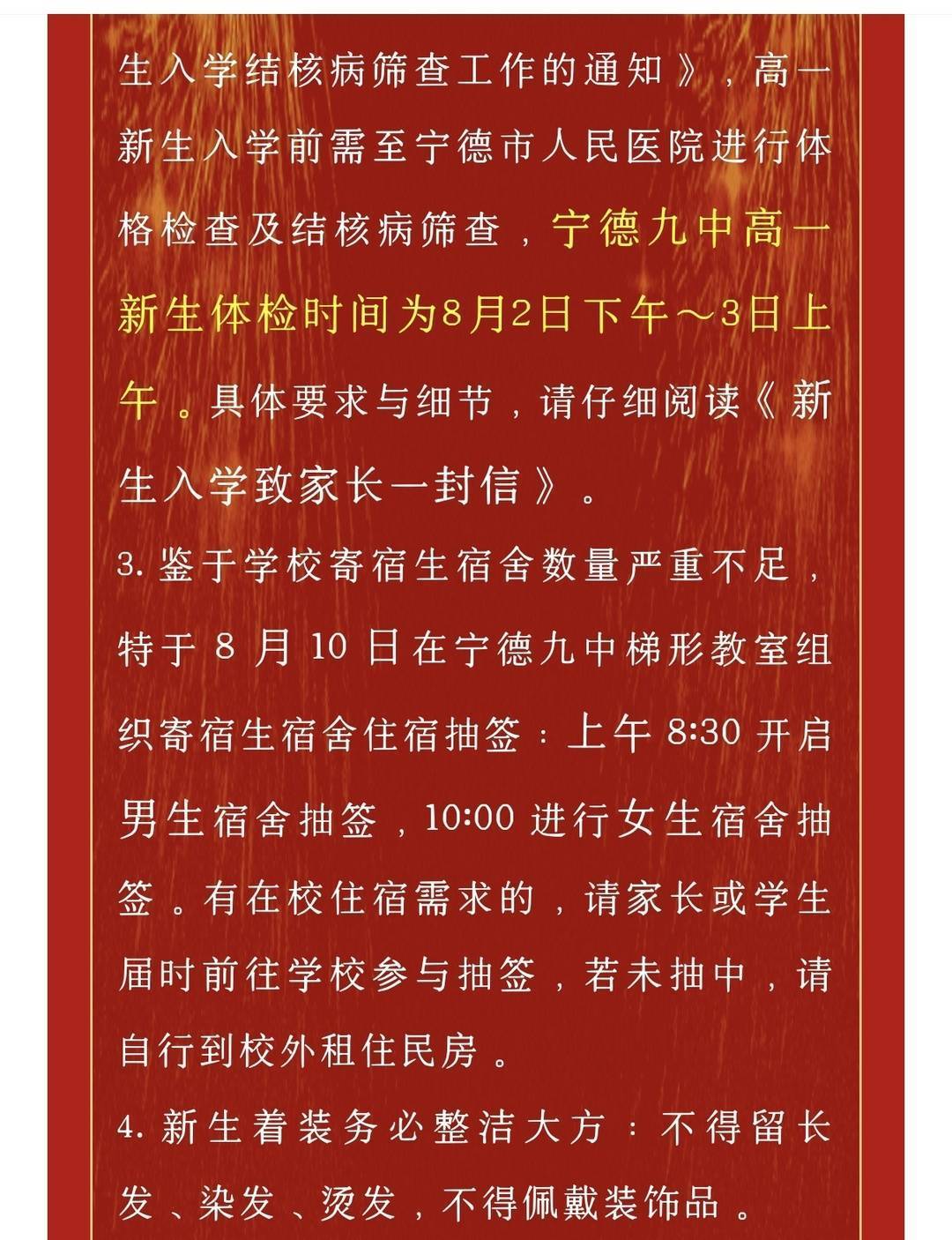 记者注意到,宁德市第九中学位于宁德市蕉城区东部沿海漳湾镇,其官方公众号确实在2024年7月31日发出一份高一新生入学须知,其中提到,鉴于学校寄宿生宿舍数量严重不足,特于8月10日在宁德九中梯形教室组织寄宿生宿舍住宿抽签:上午8:30开启男生宿舍抽签,10:00进行女生宿舍抽签,“有在校住宿需求的,请家长或学生届时前往学校参与抽签,若未抽中,请自行到校外租住民房。”