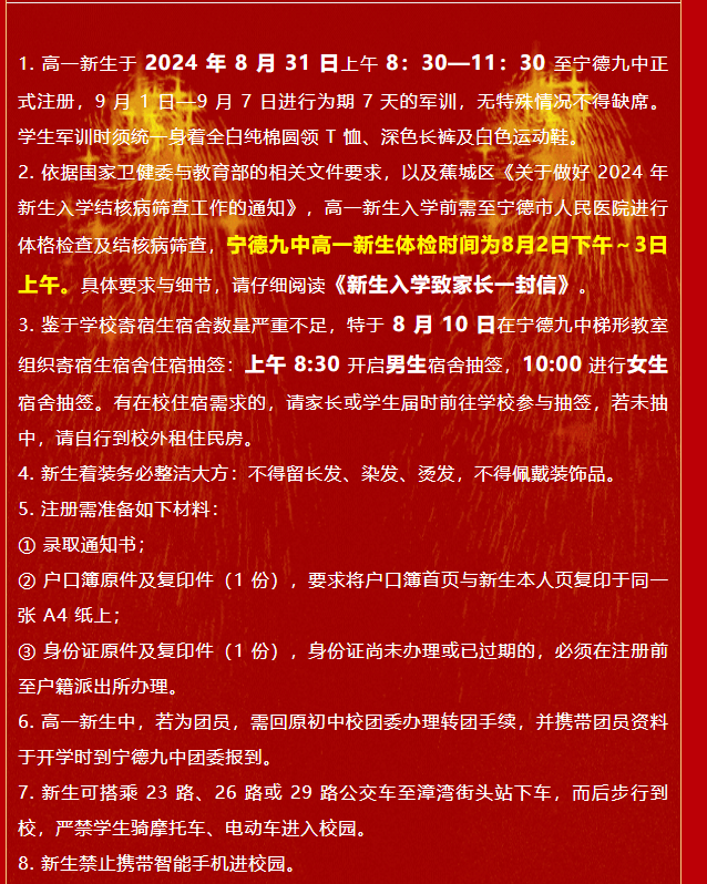△宁德市第九中学的高一新生入学须知 (受访者提供)