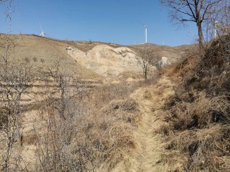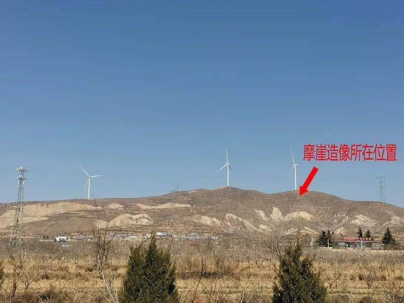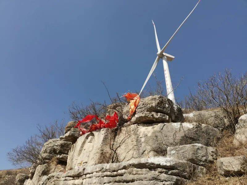 站在谷张村路口的公路边可以清楚地看到北边石山上立着三座高大的风力发电机,谷张村的摩崖造像就位于左数第三座风机的正下方山腰处。
