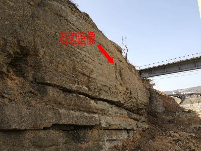 沿梅觅路向前行至位于岔口村陕焦厂附近,经过一座东西走向的公路高架桥(石川河大桥),在高架桥正下方,石川河河道的东侧有一处石壁,石壁上赫然显现着两处摩崖造像。