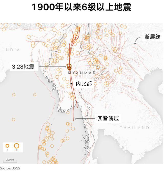 此次缅甸发生的7.9级地震位于实皆断裂带(Sagaing Fault),这是由印度板块与欧亚板块碰撞形成的断裂带之一,由北至南贯穿缅甸,穿过人口稠密的城市曼德勒、内比都等地,全长超过1200公里。