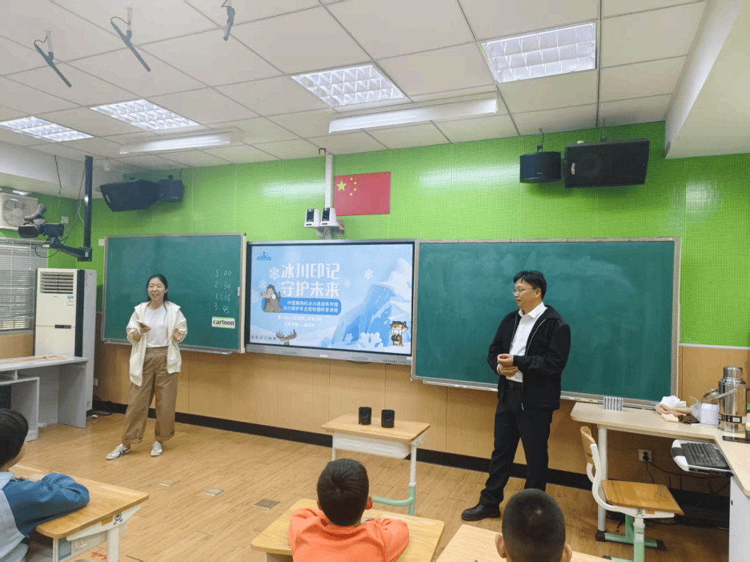4月23日,冰川馆将科普阵地延伸至北京第二实验小学德胜校区。中国地质调查局高级工程师渠洪杰以《冰川宝藏探险记:破解地球密码之温度与地球》为主题,用”温度魔法”实验揭幕科学盛宴,学生们在惊叹中直观理解了冰川作为”气候指针”的奥秘。讲座通过对比地球46亿年温度曲线与人类文明史,揭示出第四纪大冰期与人类进化的深刻关联。