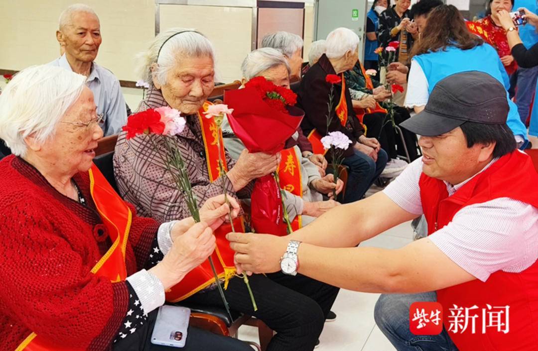 现场,全国最美志愿者、无锡市“爱心车队”李展、戴龙祥等向百岁老寿星张杏娣送上康乃馨捧花。