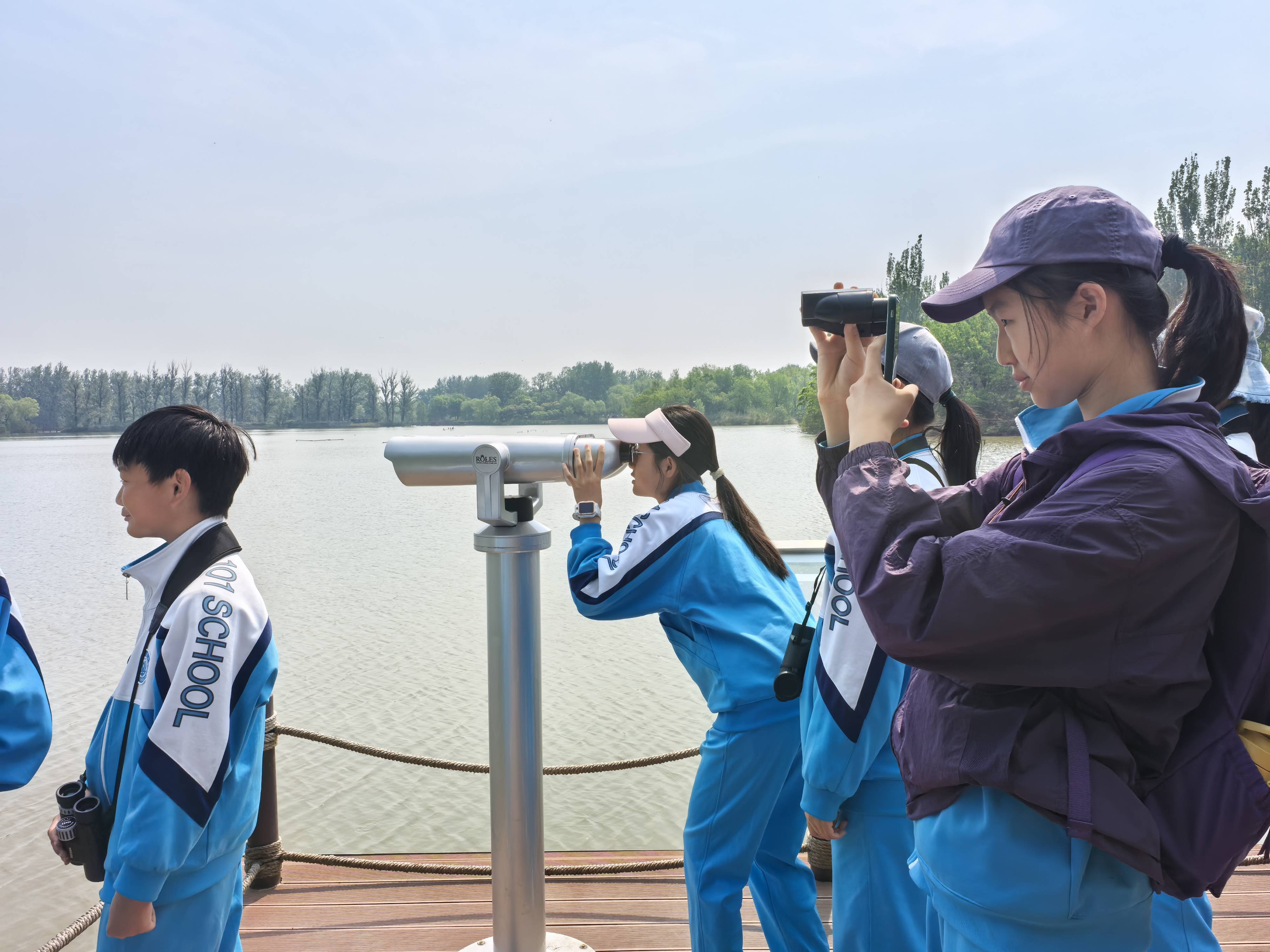 学生们正在用望远镜观测鸟类。 图源:海淀区园林绿化局