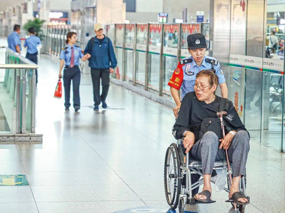 五月十七日,在湖北省武昌站,民警和铁路工作人员帮助行动不便的旅客出站。五月十八日全国助残日,各地开展丰富多彩的助残日活动。新华社发(赵军摄)