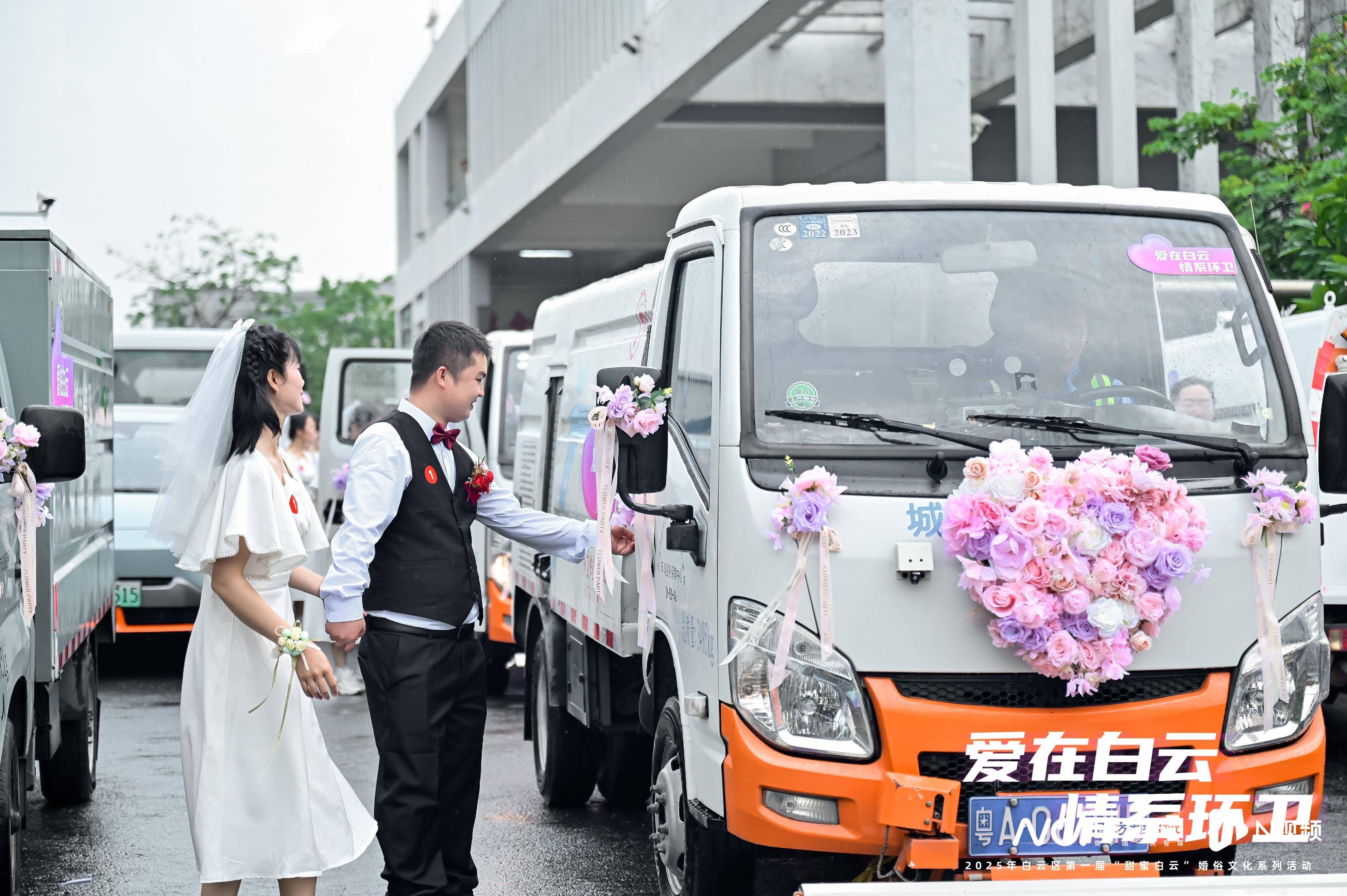 清晨,在白云区环卫保障中心,100对环卫工人夫妻们一改往日朴素的工服,身着笔挺西装与华美婚纱。此刻,熟悉的工作起点化作浪漫的出发站台,一场别具一格的迎亲仪式在此拉开帷幕。平日里穿梭在大街小巷、守护城市洁净的环卫车队,摇身一变成为迎亲“主力军”。一辆辆精心装扮过的环卫车、洒水车,鲜花簇拥、彩带飘扬,宛如童话里的花车。环卫“迎亲车队”从保障中心驶向婚礼现场,所经之处,行人纷纷驻足,投来惊喜、祝福的目光。