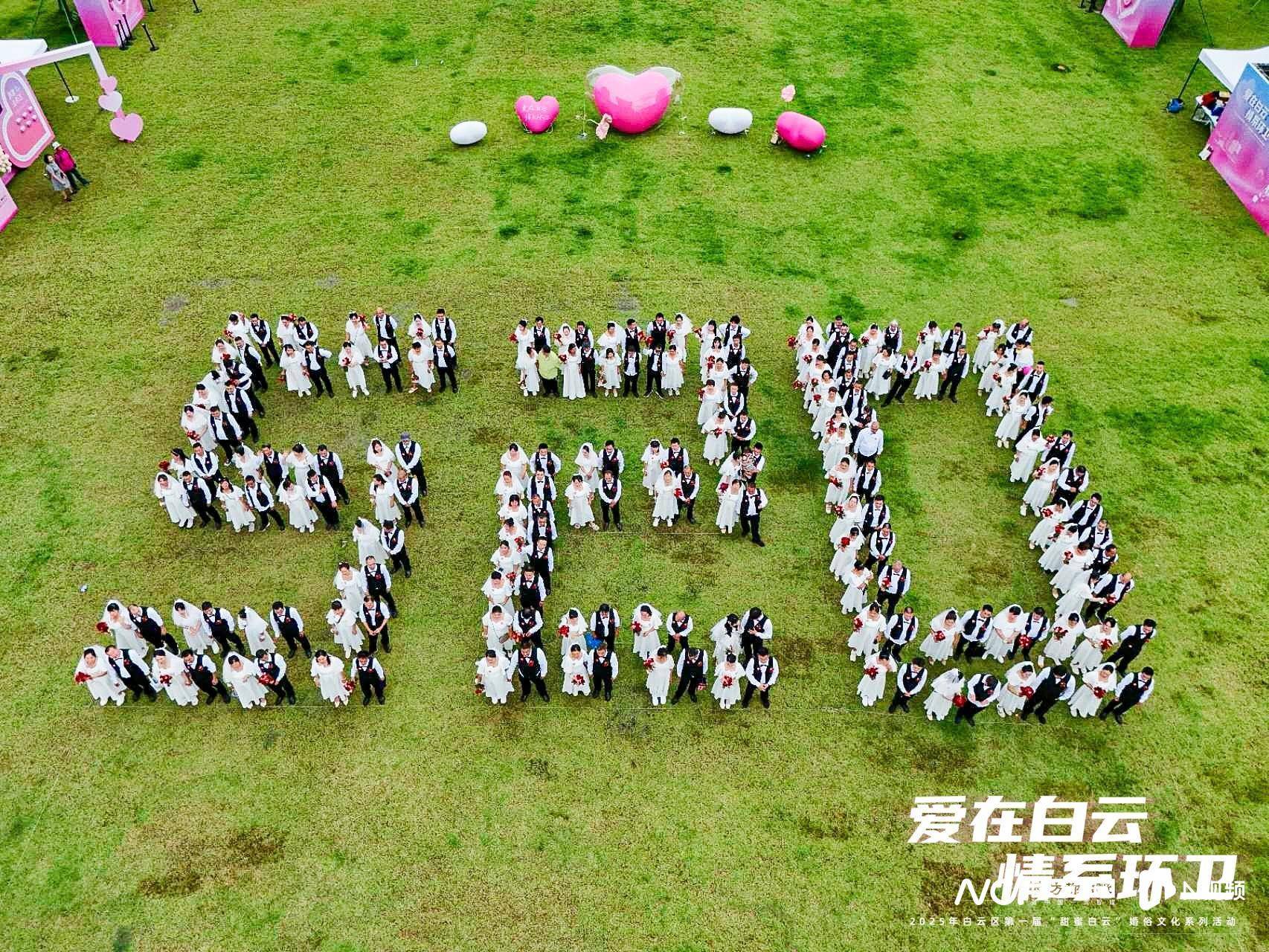 舞台仪式环节,在白云区环卫工联会主席的见证下,100对环卫工人夫妻互相交换告白卡片,用质朴而真挚的话语表达对彼此的爱意和感激。仪式尾声,全体参与者共同组成“520”字样进行航拍,用照片将这一温馨的时刻定格。