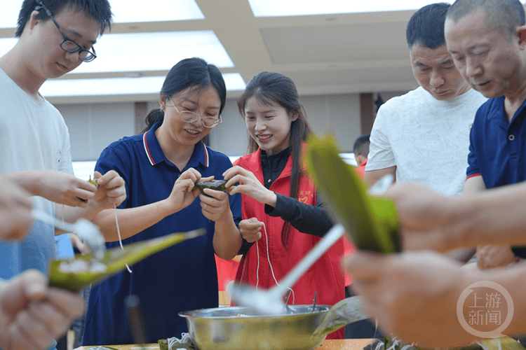 志愿者和印务有限公司的残疾员工一起包粽子。
