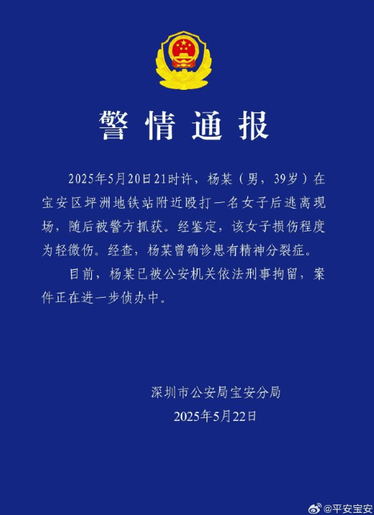 2025年5月20日21时许,杨某(男,39岁)在宝安区坪洲地铁站附近殴打一名女子后逃离现场,随后被警方抓获。经鉴定,该女子损伤程度为轻微伤。经查,杨某曾确诊患有精神分裂症。