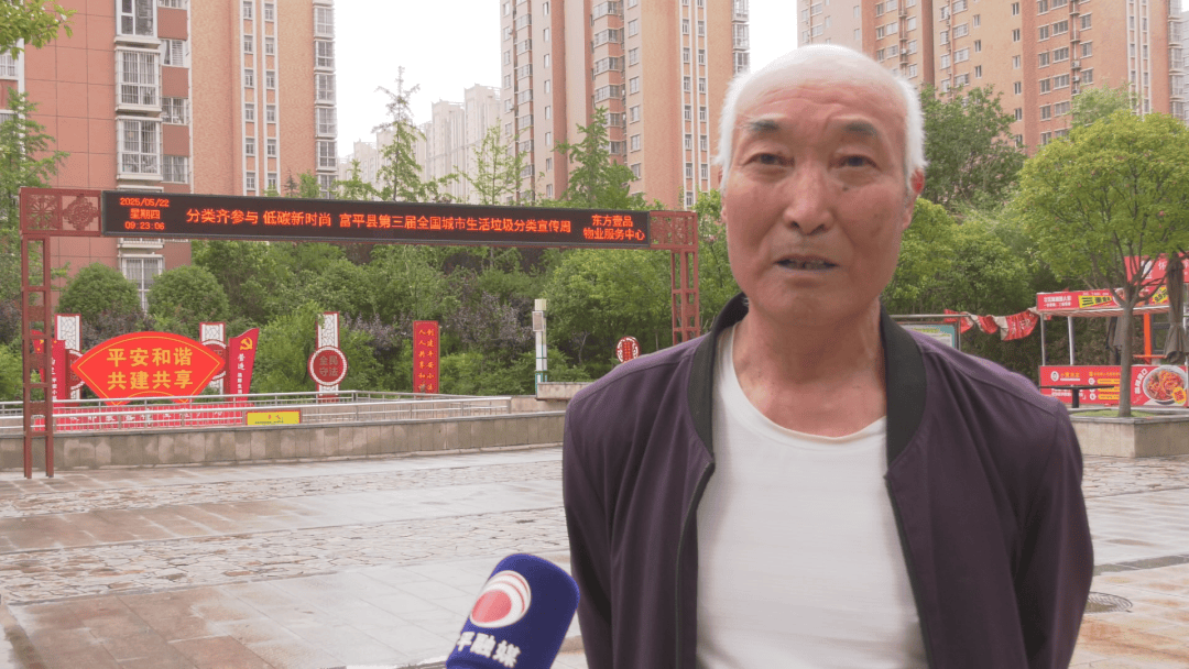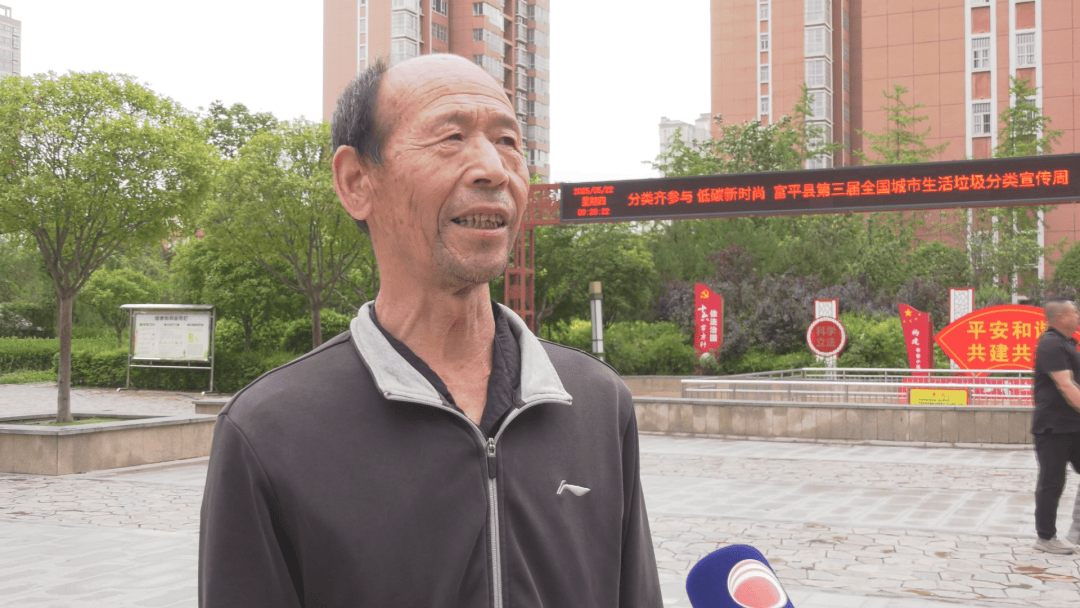 富平县垃圾分类志愿者:咱这垃圾分为几类?你看分为四类,可回收、再一个厨余垃圾、有害垃圾、其他垃圾。