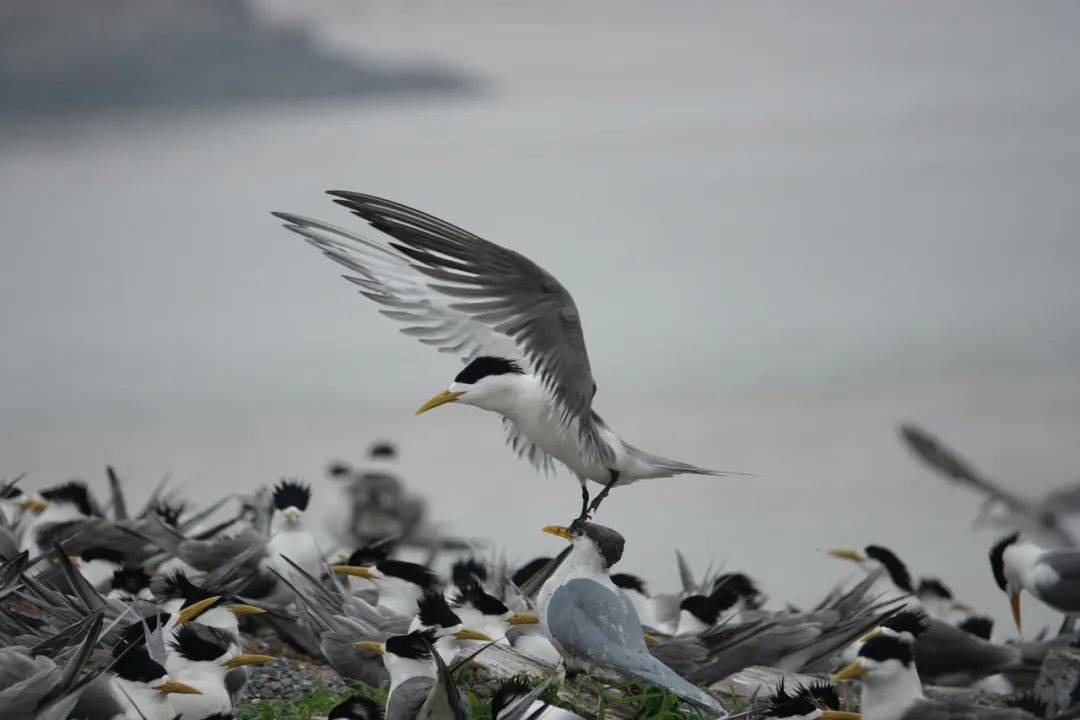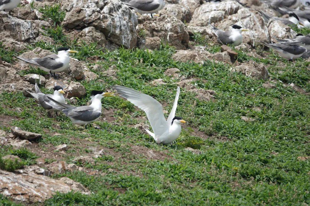 “看房满意决定落户”的燕鸥,有几种求偶仪式——共舞、献鱼和伴飞,这些都是监测员眼中非常有趣的纯天然演出。遇到心仪的对象时,燕鸥会在地上张开翅膀互相转圈跳舞。
