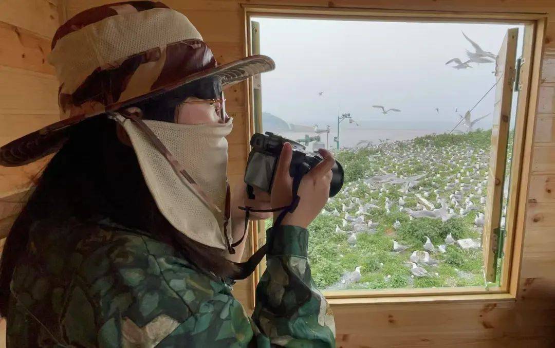 为避免惊扰燕鸥的私生活,保护区对船只靠近和人员活动有严格的限制。监测员也必须和燕鸥们保持距离,直到它们趴窝孵蛋稳定、不会轻易弃巢后,才能轻手轻脚进入丫鹊山上的小屋,进行近距离监测。狭窄的小屋涂着绿漆外罩迷彩网,只留两扇观察窗。燕鸥们就在眼皮子底下的感觉实在太幸福了!但也战战兢兢如履薄冰,生怕一不小心引来亲鸟们的警觉,给它们带去生存压力。