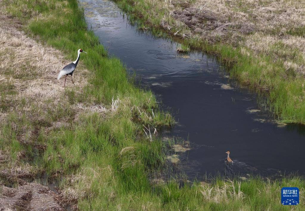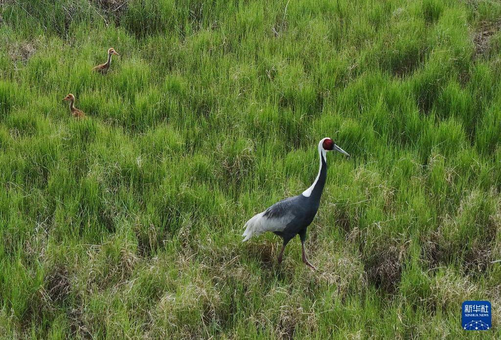 5月24日,在黑龙江三环泡国家级自然保护区一处湿地,白枕鹤携雏鸟觅食(无人机照片)。
