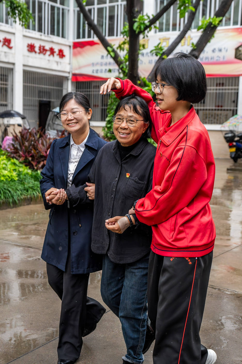 5月27日,一名华坪女高学生(右)用手给张桂梅(中)挡雨。新华社记者 胡超 摄