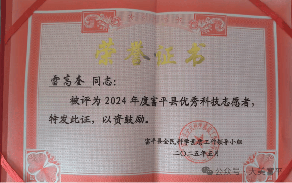5月30日, 富平县全民科学素质工作小组对2025年度富平县优秀科技工作人员及2024年度富平县优秀科技志愿者进行表彰,雷高奎同志荣获“2024年度富平县优秀科技志愿工作者”称号。