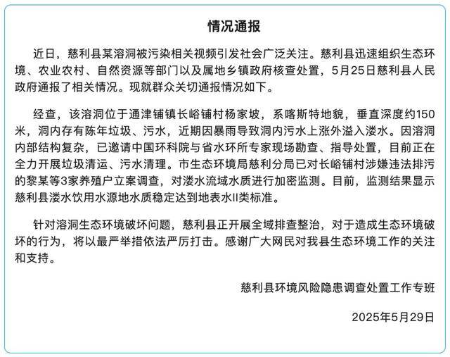 5月29日,慈利县环境风险隐患调查处置工作专班再次通报,称被污染的溶洞系喀斯特地貌,垂直深度约150米,洞内存有陈年垃圾、污水,近期因暴雨导致洞内污水上涨外溢入溇水。