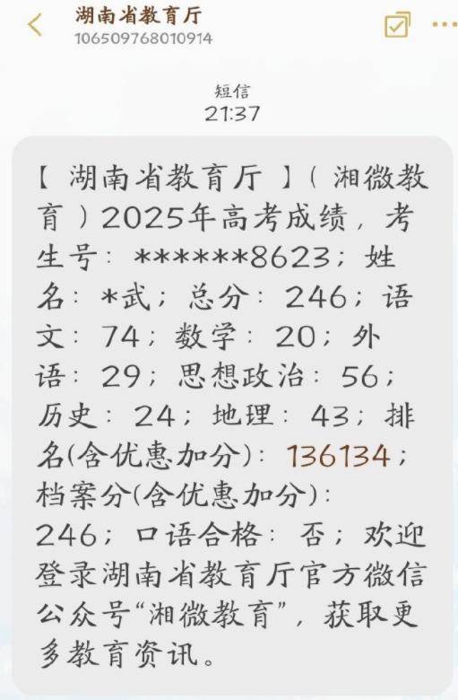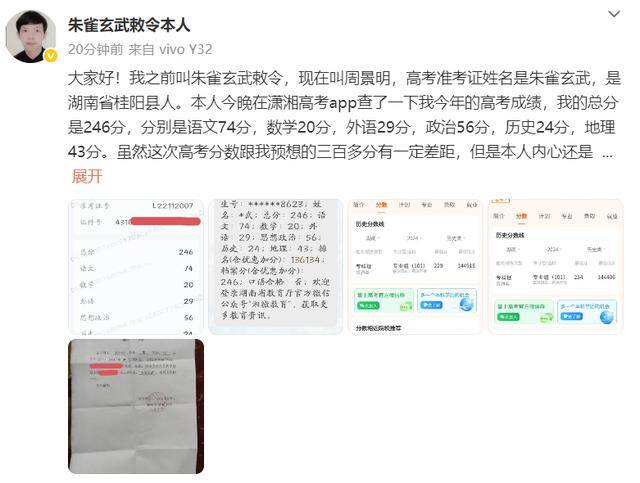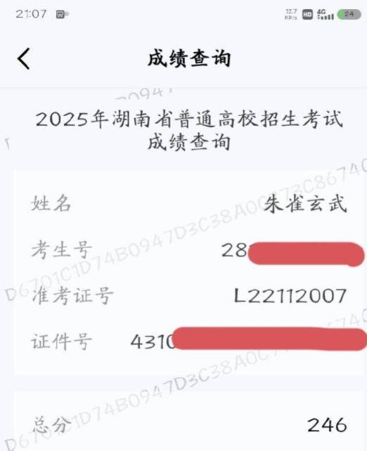 大家好!我之前叫朱雀玄武敕令,现在叫周景明,高考准考证姓名是朱雀玄武,是湖南省桂阳县人。本人今晚在潇湘高考app查了一下我今年的高考成绩,我的总分是246分,分别是语文74分,数学20分,外语29分,政治56分,历史24分,地理43分。虽然这次高考分数跟我预想的三百多分有一定差距,但是本人内心还是很平静。因为我查了一下往年高考高职专科录取情况,我的这个分数保底可以去新疆的两所职业学院,分别是喀什职业技术学院,可克达拉职业技术学院。之前我都去西藏职业技术学院上过学,这次如果被新疆的职业学院顺利录取,我也会去上大学,反正我是有书读了。