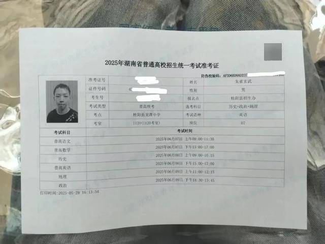 6月4日下午,湖南省郴州市桂阳县“00后”小伙“朱雀玄武”,从教育部门拿到了自己的高考准考证,准备参加2025年湖南省普通高校招生统一考试。
