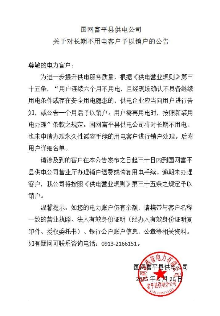国网富平县供电公司关于对长期不用电客户予以销户的公告 来源: 富平微视 发布: 2025年6月27日 16:25 来源:富平微视 内容举报 免责声明:本文转自官方媒体或协会发布(除网友投稿)。This article is sourced from official media or association releases (excluding submissions from netizens).本文链接:https://www.fpgynews.com/30485.html 责任编辑: 李飞(GY_02)
