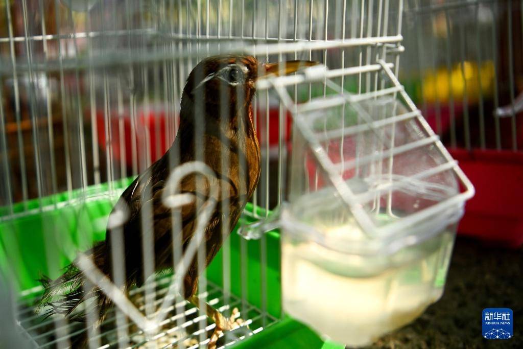 6月29日在西安浐灞国家湿地公园内拍摄的等待放归的画眉鸟。
