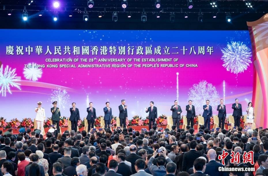 7月1日,香港特区政府在香港会议展览中心大会堂举办酒会,庆祝香港回归祖国28周年和香港特别行政区成立28周年。图为香港特区行政长官李家超(中)等嘉宾共同举杯致意。