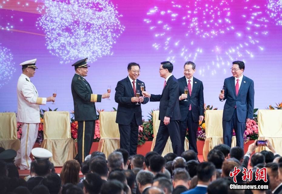 7月1日,香港特区政府在香港会议展览中心大会堂举办酒会,庆祝香港回归祖国28周年和香港特别行政区成立28周年。图为香港特区行政长官李家超(右三)和中央人民政府驻香港特别行政区联络办公室主任周霁(右一)、中央人民政府驻香港特别行政区维护国家安全公署署长董经纬(右二)、外交部驻香港特别行政区特派员公署特派员崔建春(左三)、中国人民解放军驻香港部队司令员彭京堂(左二)、中国人民解放军驻香港部队政治委员赖如鑫(左一)碰杯致意。中新社记者 侯宇 摄