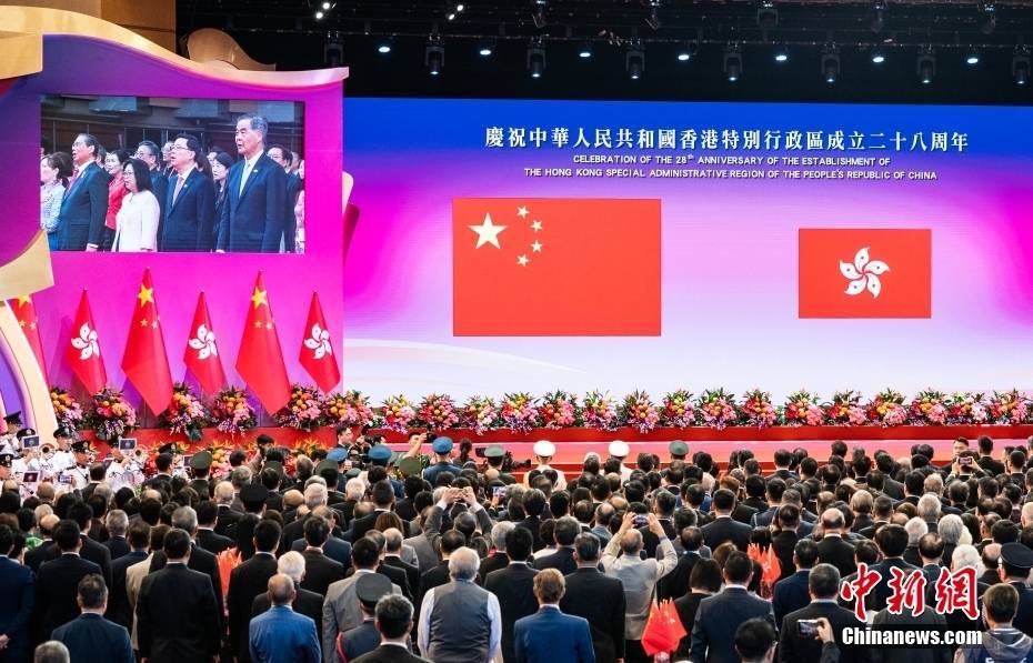 7月1日,香港特区政府在香港会议展览中心大会堂举办酒会,庆祝香港回归祖国28周年和香港特别行政区成立28周年。图为全场肃立奏唱国歌。中新社记者 侯宇 摄