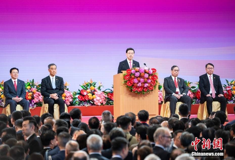7月1日,香港特区政府在香港会议展览中心大会堂举办酒会,庆祝香港回归祖国28周年和香港特别行政区成立28周年。图为香港特区行政长官李家超(中)致辞。中新社记者 侯宇 摄