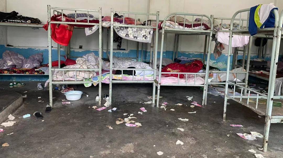 2019年的暑假,我们也去过这个学校,当时看见宿舍也很脏,校长解释说是因为毕业放假了,学生撕书本到处扔,所以很脏。但这次去,明明学校在上课,还是这么乱。这根本不是花钱能解决的,真的跟学校管理关系很大。